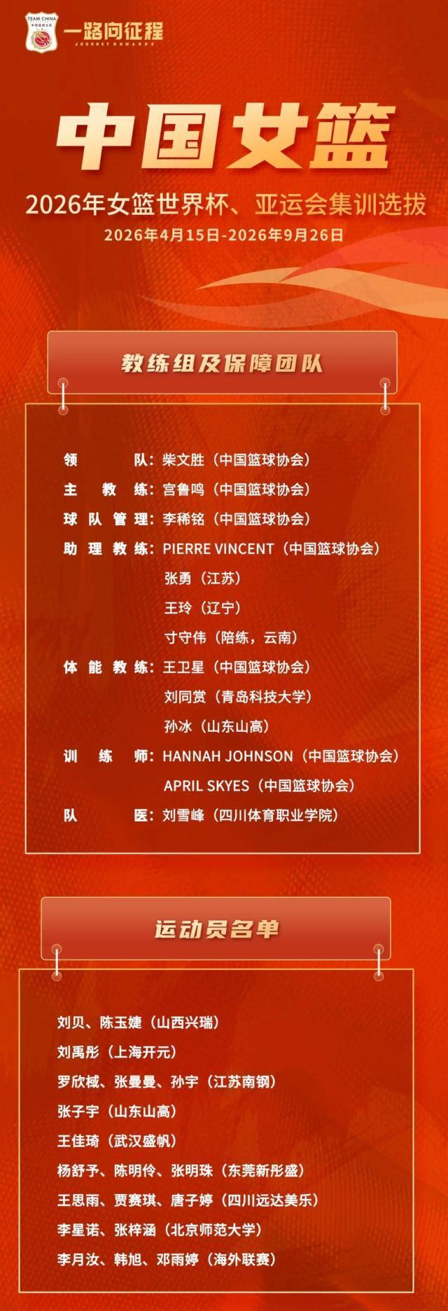 中国篮协将于2026年4月15日起在北京体育大学组织国家女篮集训选拔工作。结合2025-26赛季WCBA联赛推进情况,国家女篮教练组将依据队员在联赛中的竞技状态、队伍位置需要及集训表现,对集训人员进行动态调整。队伍计划于4月至6月在北京分批次开展集训,期间将在国内参与国际热身赛,随后分别赴澳大利亚和欧洲进行热身赛,热身赛后前往德国柏林参加女篮世界杯。世界杯结束后,队伍将出发参加2026年爱知·名古屋亚运会。