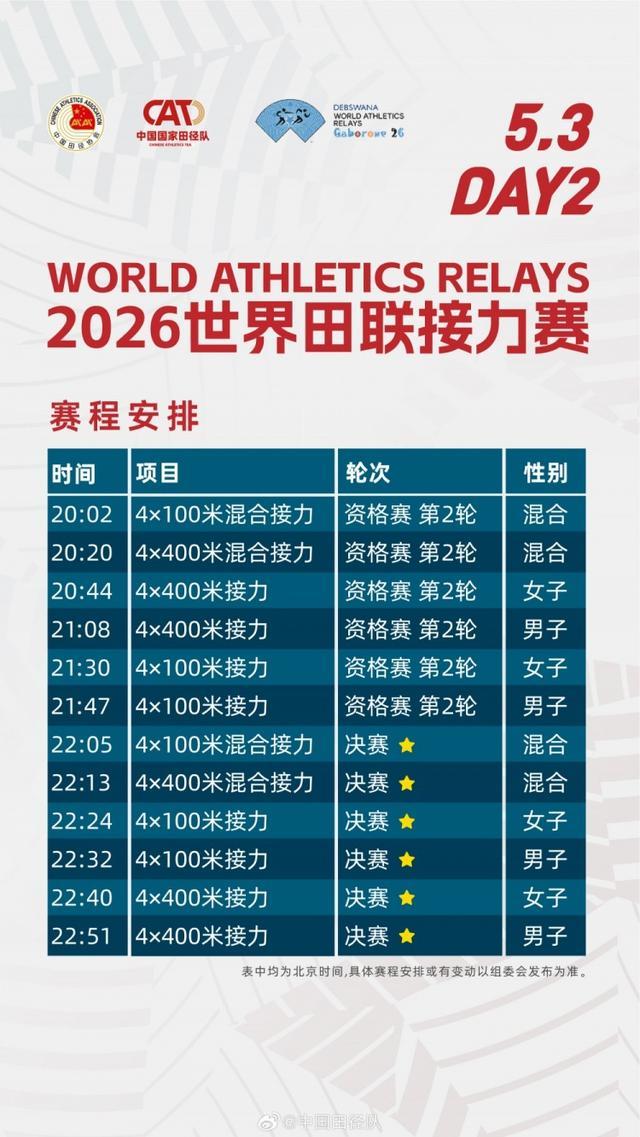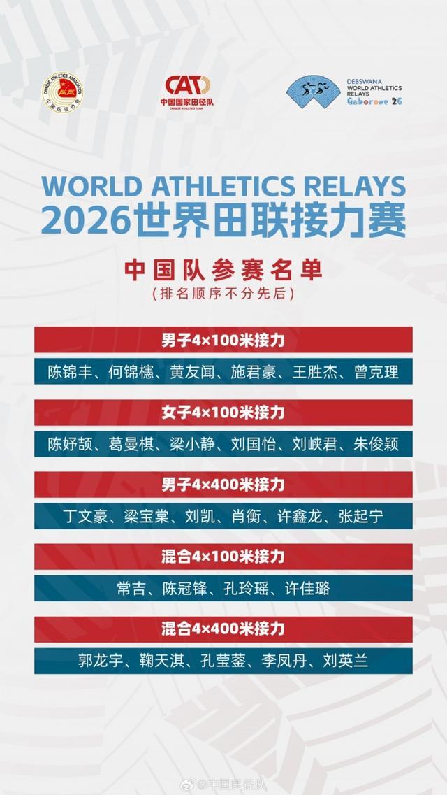 直播吧4月27日讯 2026年5月2日至3日,2026世界田联接力赛将于博茨瓦纳哈博罗内正式打响。中国田径队公布参赛名单与赛程。
